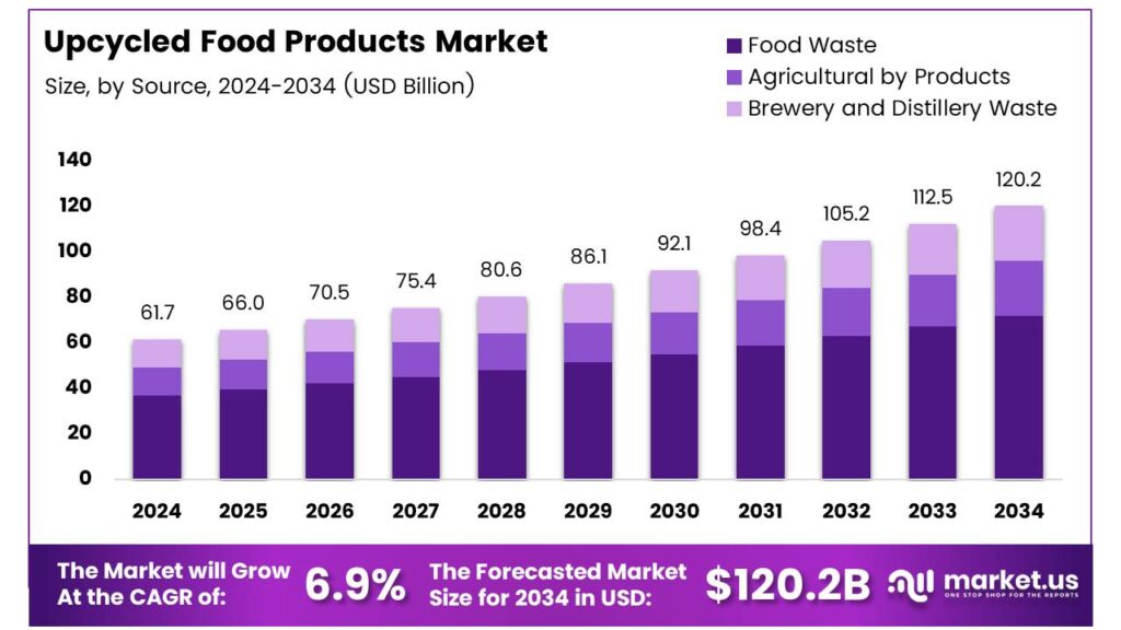 - The Global Upcycled Food Products Market is projected to grow from USD 61.7 billion in 2024 to USD 120.2 billion by 2034 at a 6.9% CAGR.