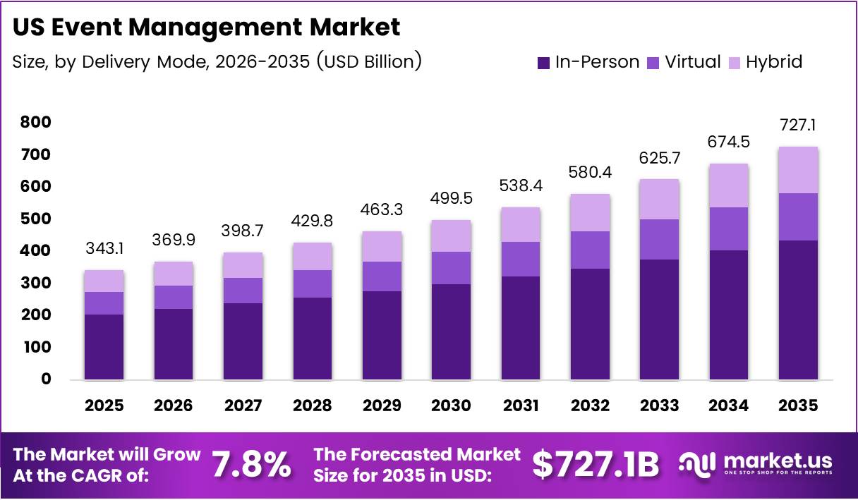 The US Event Management Market size is expected to be worth around $727.1 billion by 2035 from $343.1 billion in 2025, growing at a CAGR of 7.8% during the forecast period from 2026 to 2035. This substantial expansion reflects the increasing importance of professionally managed events across corporate, government, and social sectors.