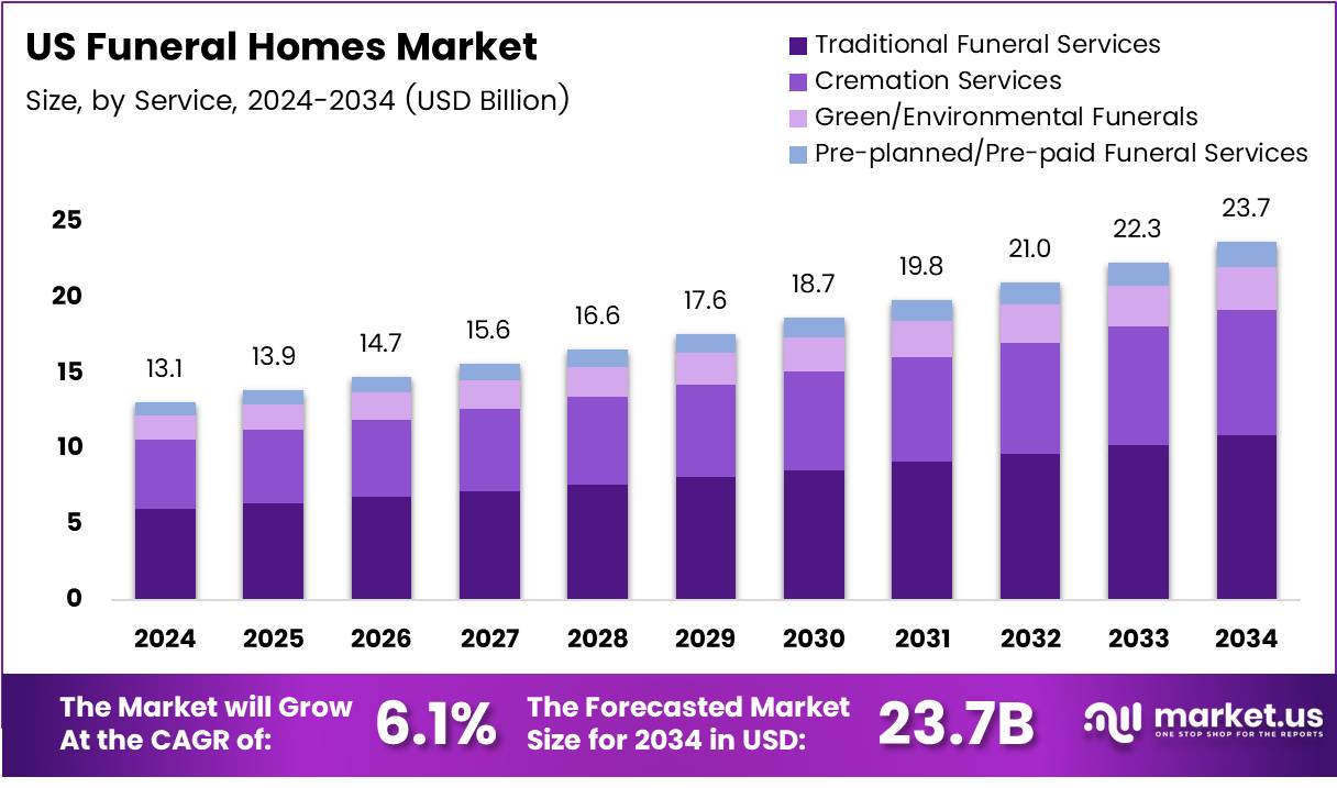 The US Funeral Homes Market size is expected to be worth around USD 23.7 Billion by 2034, from USD 13.1 Billion in 2024, growing at a CAGR of 6.1% during the forecast period from 2025 to 2034.