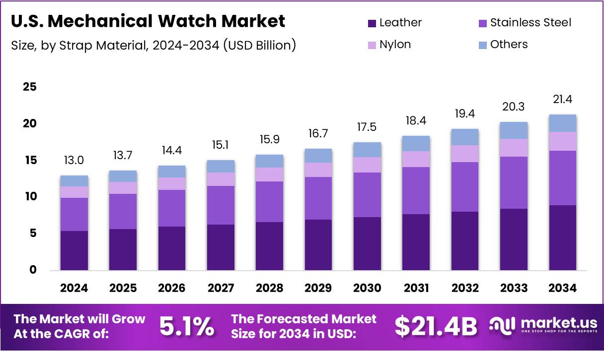 - The U.S. Mechanical Watch Market is projected to grow from USD 13.0 Billion in 2024 to USD 21.4 Billion by 2034, at a CAGR of 5.1%.