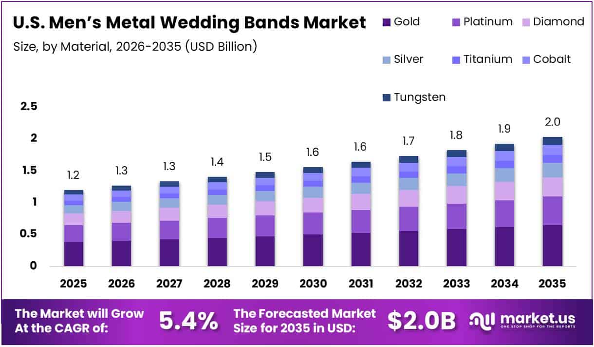 The U.S. Men’s Metal Wedding Bands Market size is expected to be worth around USD 2.0 Billion by 2035 from USD 1.2 Billion in 2025, growing at a CAGR of 5.4% during the forecast period 2026 to 2035.