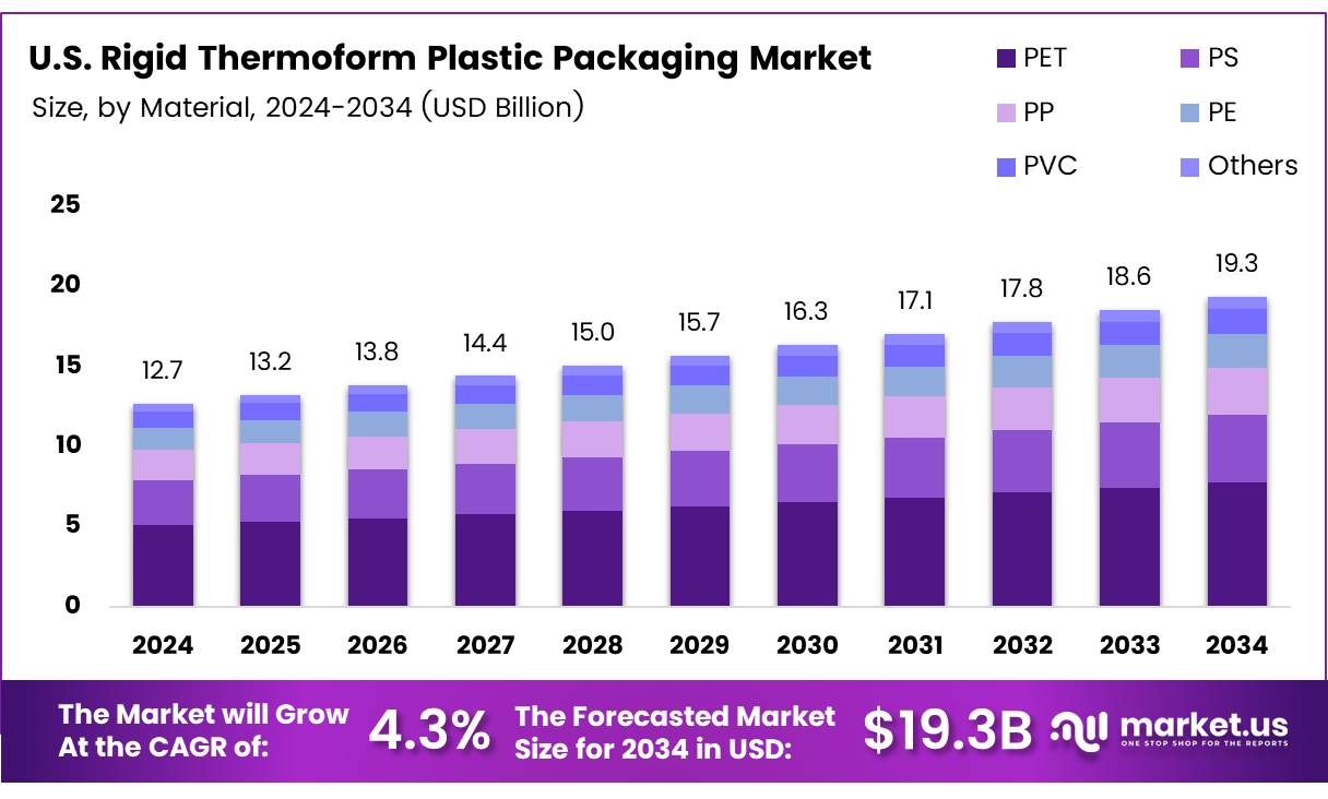 - The U.S. Rigid Thermoform Plastic Packaging Market is expected to reach USD 19.3 Billion by 2034, growing at a CAGR of 4.3%.