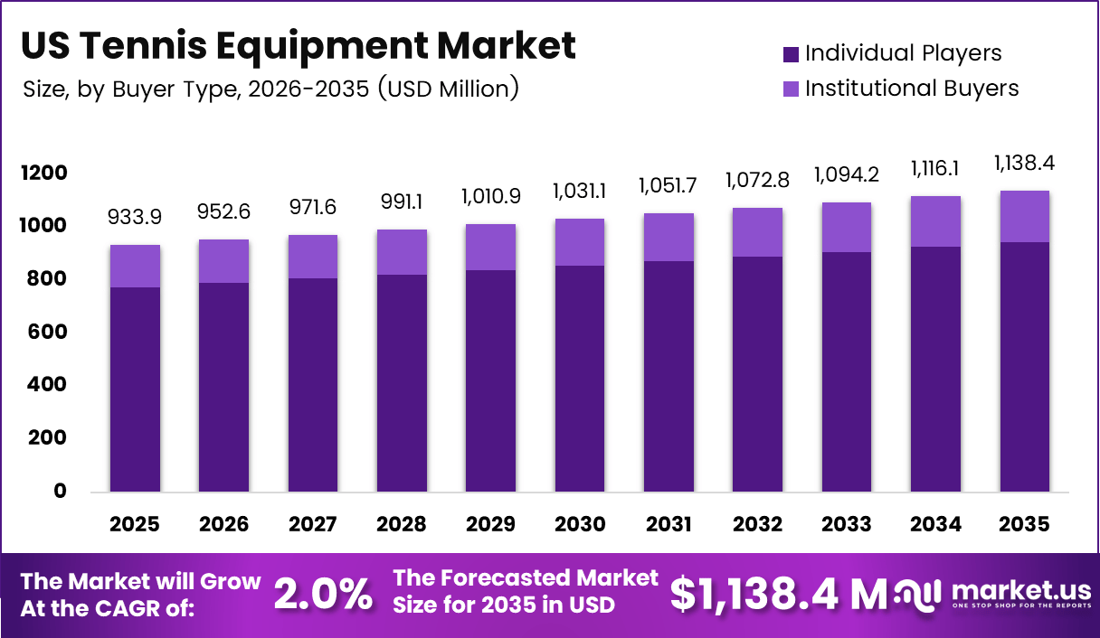 - The US Tennis Equipment Market is projected to reach USD 1,138 million by 2035, growing from USD 933.9 million in 2025 at a CAGR of 2%.