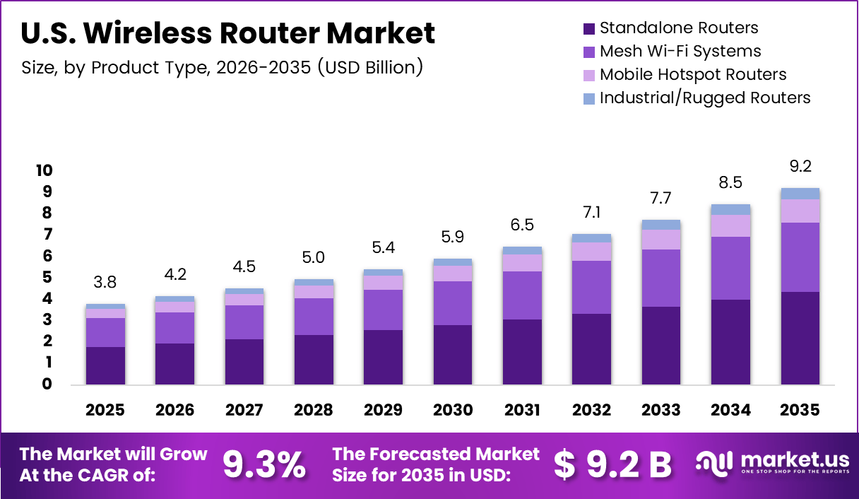 - The U.S. Wireless Router Market is projected to reach USD 9.2 billion by 2035 from USD 3.8 billion in 2025, expanding at a 9.3% CAGR.