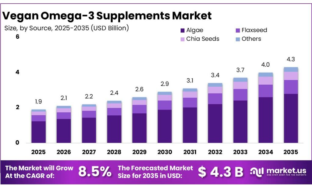- Vegan Omega-3 Supplements Market size is expected to be worth around USD 4.3 Billion by 2035, from USD 1.9 Billion in 2025, growing at a CAGR of 8.5%.