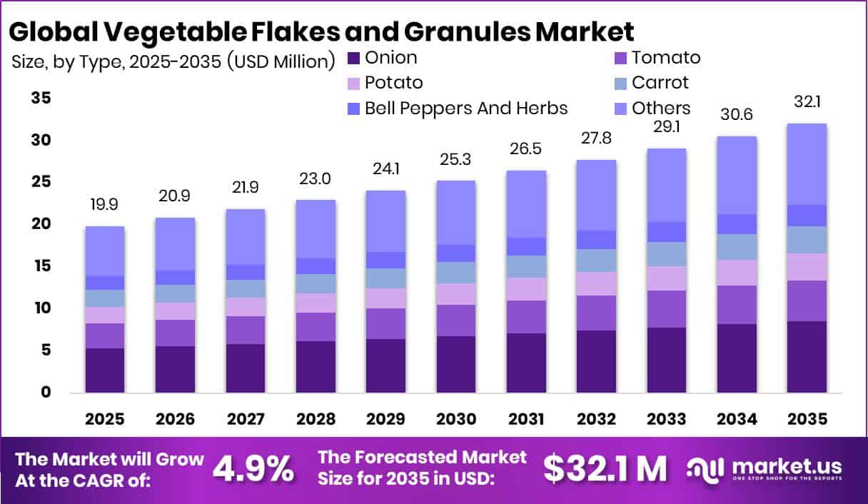 - The Global Vegetable Flakes and Granules Market is expected to be worth around USD 32.1 billion by 2035, up from USD 19.9 billion in 2025. It is projected to grow at a CAGR of 4.9% from 2026 to 2035.
