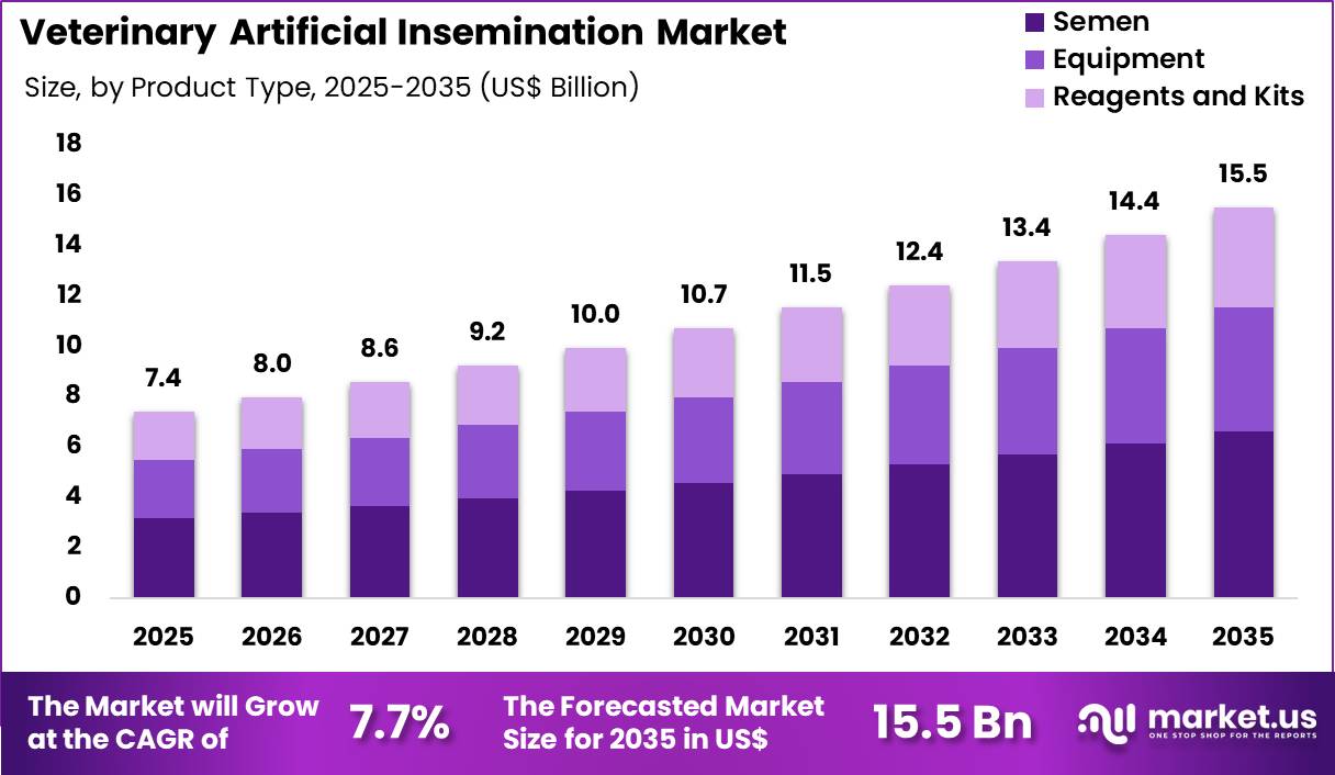 The Global Veterinary Artificial Insemination Market size is expected to be worth around US$ 15.5 Billion by 2035 from US$ 7.4 Billion in 2025, growing at a CAGR of 7.7% during the forecast period 2026-2035. In 2025, North America led the market, achieving over 35.8% share with a revenue of US$ 2.7 Billion.