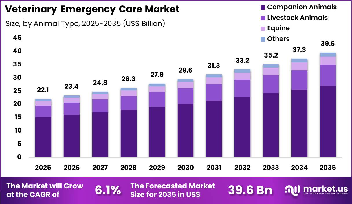 Emergency services are projected to become more accessible as veterinary infrastructure improves. As pets are increasingly treated as family members, companion animals are estimated to maintain their dominant position in this market.