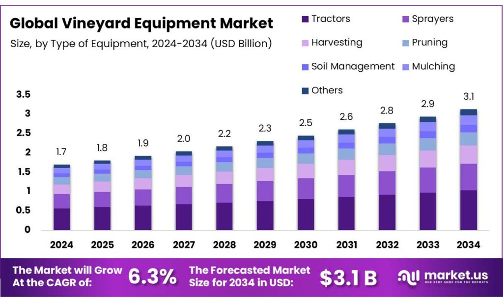 - Vineyard Equipment Market size is expected to be worth around USD 3.1 Billion by 2034, from USD 1.7 Billion in 2024, growing at a CAGR of 6.3%.