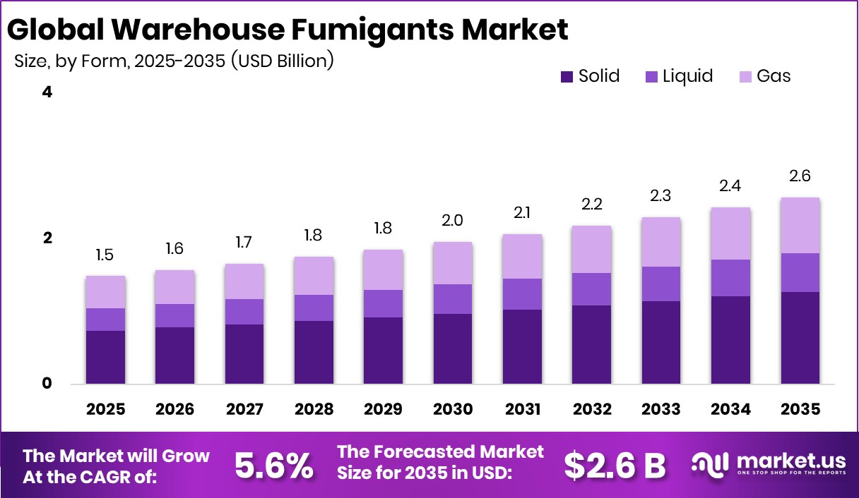 - The Global Warehouse Fumigants Market is expected to be worth around USD 2.6 billion by 2034, up from USD 1.5 billion in 2024, and is projected to grow at a CAGR of 5.6% from 2025 to 2034.