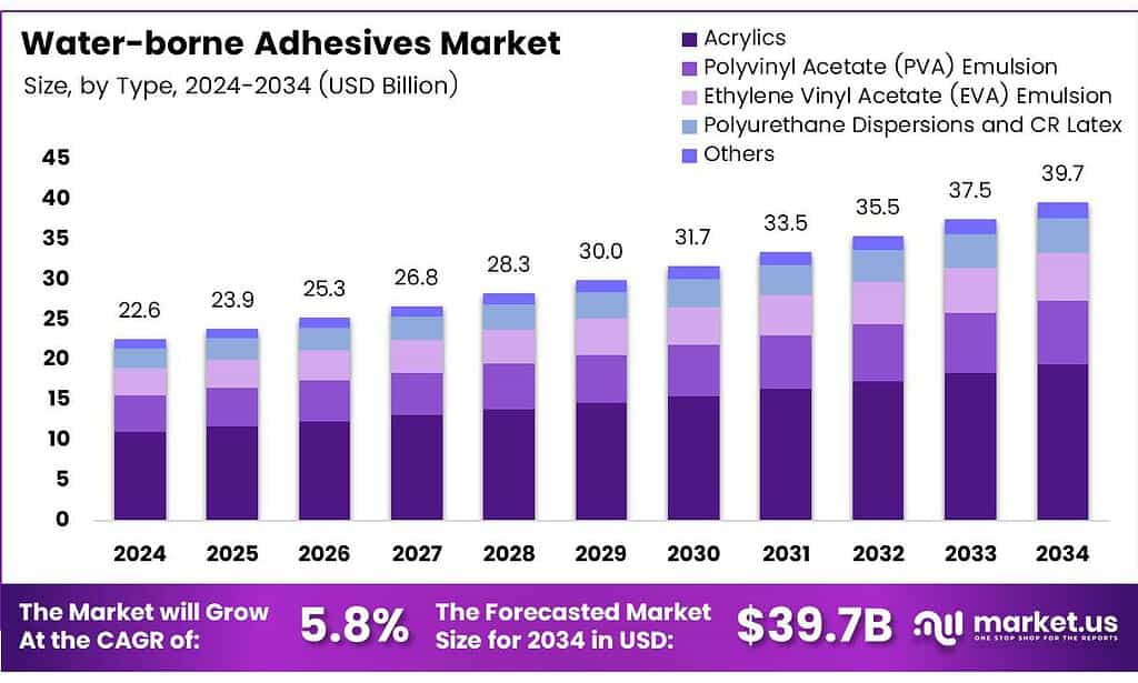 - The Global Water-borne Adhesives Market is projected to grow from USD 22.6 billion in 2024 to USD 39.7 billion by 2034 at a CAGR of 5.8%.
