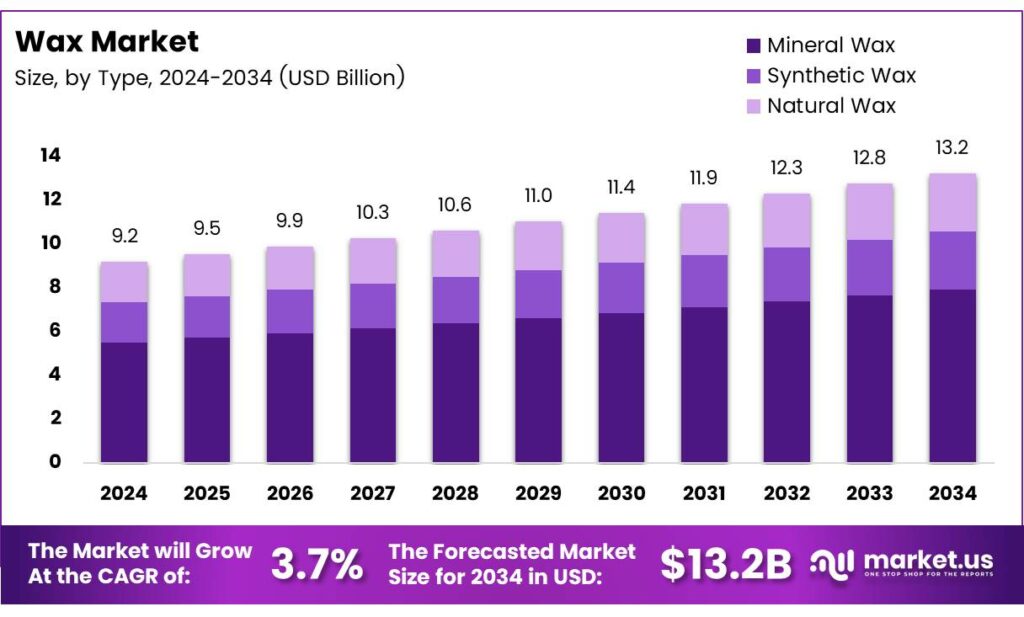 - The Global Wax Market is valued at USD 9.2 billion in 2024 and is projected to reach USD 13.2 billion by 2034, at a CAGR of 3.7% during the forecast period 2025 to 2034.