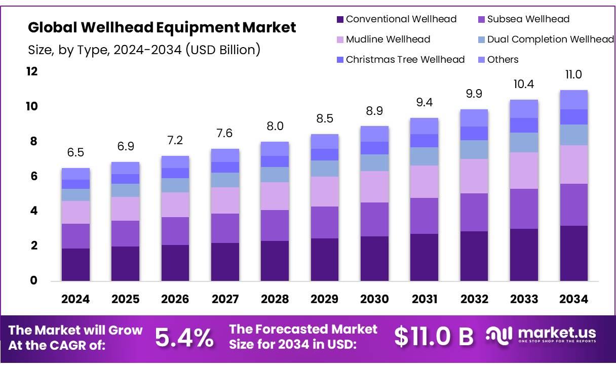The Global Wellhead Equipment Market size is expected to be worth around USD 11.0 Bn by 2034, from USD 6.5 Bn in 2024, growing at a CAGR of 5.4% during the forecast period from 2025 to 2034.
