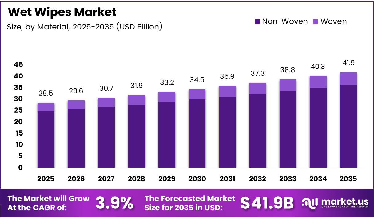Global Wet Wipes Market size is expected to be worth around USD 41.9 Billion by 2035 from USD 28.5 Billion in 2025, growing at a CAGR of 3.9% during the forecast period 2026 to 2035.