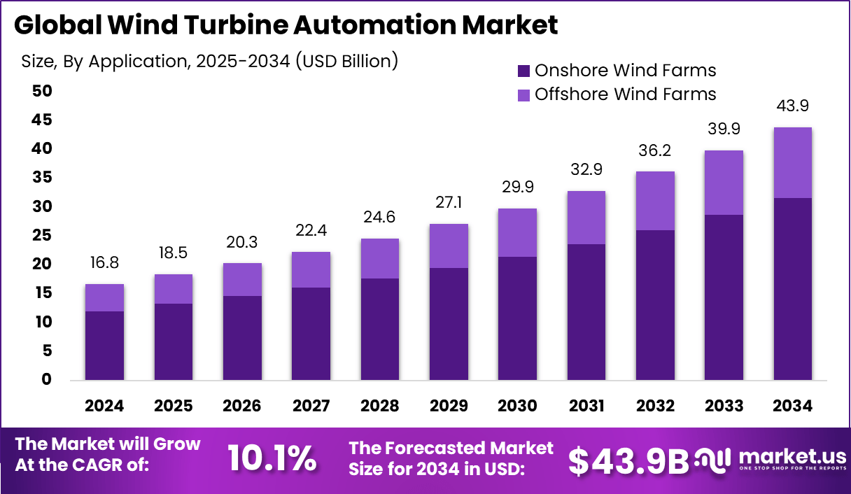- The Global Wind Turbine Automation Market was valued at USD 16.8 Billion in 2024 and is forecasted to grow significantly, reaching USD 43.9 Billion by 2034, expanding at a CAGR of 10.1%, supported by increasing demand for renewable energy and efficient turbine operations.