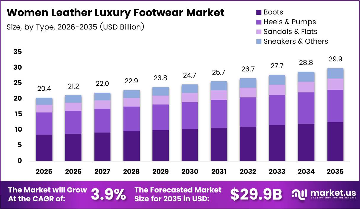Global Women Leather Luxury Footwear Market size is expected to be worth around USD 29.9 Billion by 2035 from USD 20.4 Billion in 2025, growing at a CAGR of 3.9% during the forecast period 2026 to 2035.
