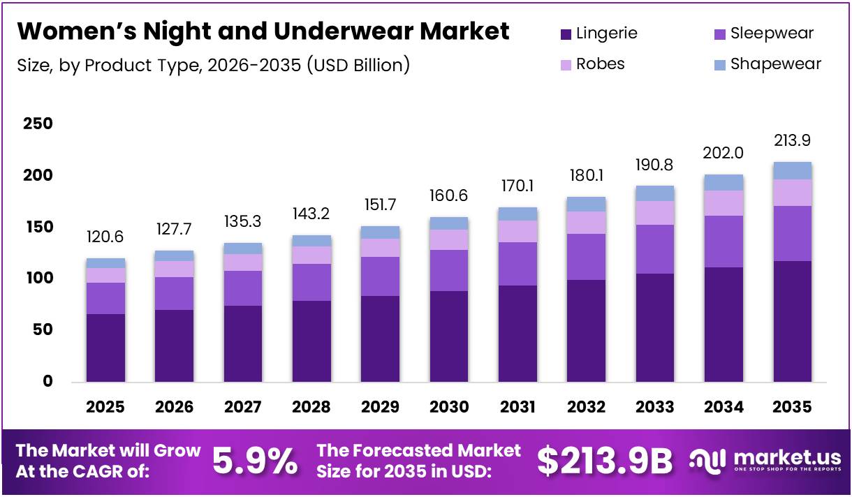 The Global Women’s Night and Underwear Market size is expected to be worth around USD 213.9 Billion by 2035 from USD 120.6 Billion in 2025, growing at a CAGR of 5.9% during the forecast period 2026 to 2035.