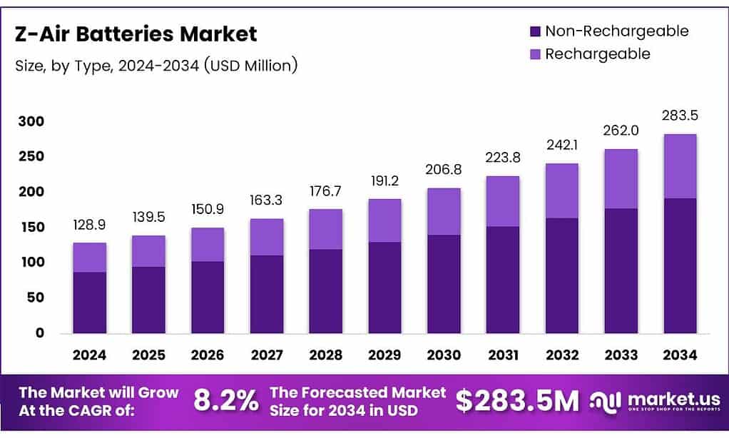 The Global Z-Air Batteries Market size is expected to be worth around USD 283.5 Million by 2034, from USD 128.9 Million in 2024, growing at a CAGR of 8.2% during the forecast period from 2025 to 2034.