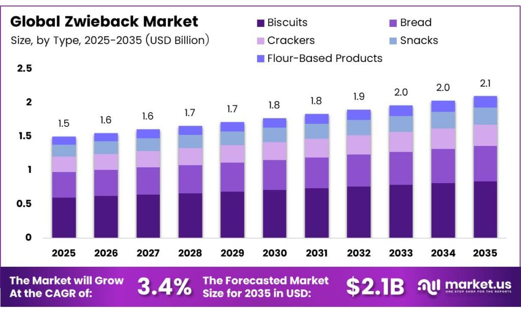 The Global Zwieback Market size is expected to be worth around USD 2.1 billion by 2035 from USD 1.5 billion in 2025, growing at a CAGR of 3.4% during the forecast period 2026 to 2035.