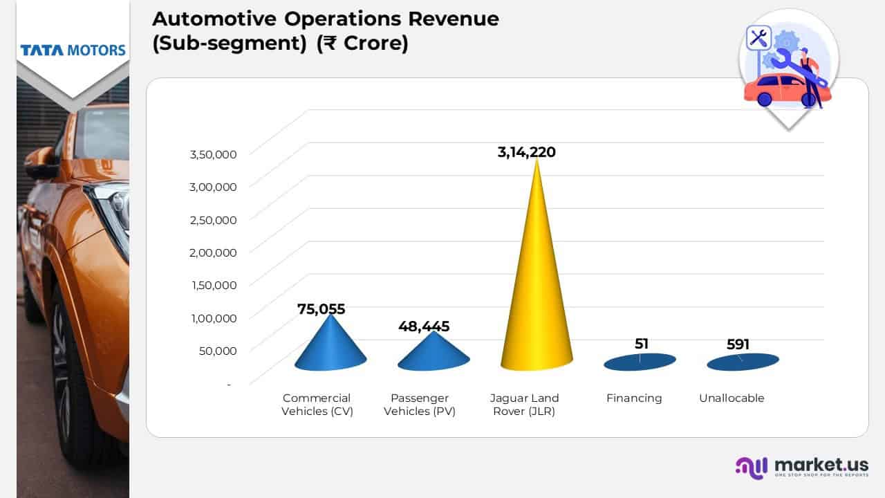 The Automotive segment encompasses the entire spectrum of activities related to vehicle design, manufacturing, assembly, sales, and service, along with car financing and the sale of accessories and spare parts. This segment is further divided into 4 key sub-segments: Tata Passenger Vehicles, Jaguar Land Rover (JLR), Tata Commercial Vehicles, and Vehicle Financing. The Other Operations segment covers the company’s information technology and insurance brokerage services.