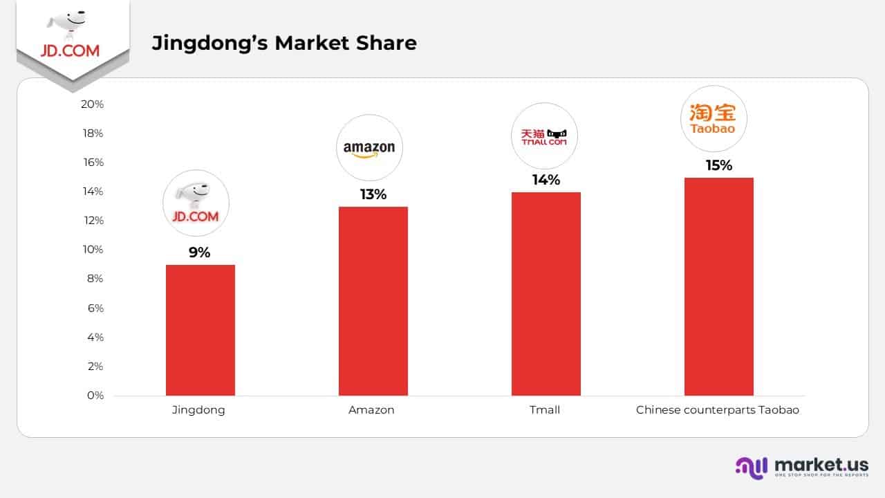 - Jingdong commands a global market share of 9%, placing it fourth behind its larger Jeff Bezos’ Amazon (13%), Tmall (14%), and as well as Chinese counterparts Taobao (15%).