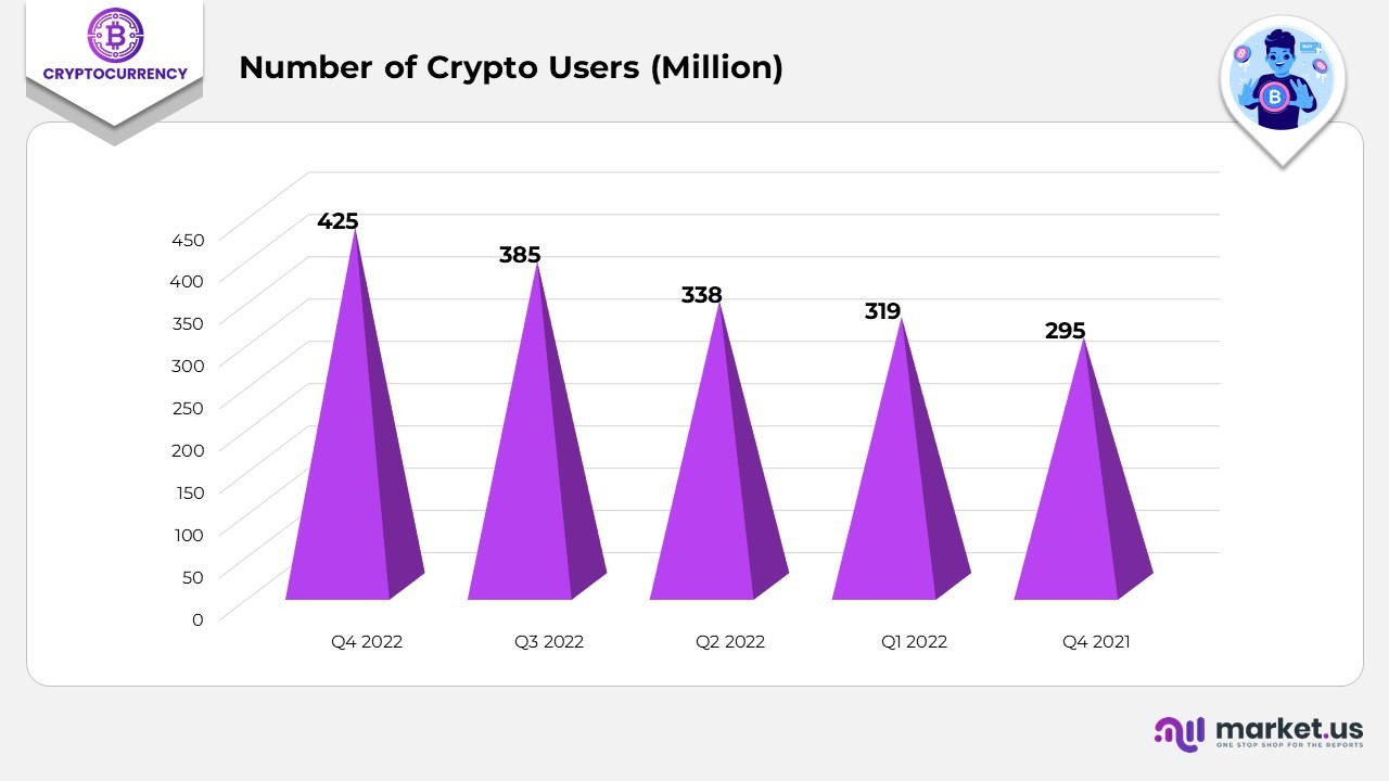 - By Q4 2022, the global cryptocurrency user base had climbed to 425 million, marking a significant surge in adoption.