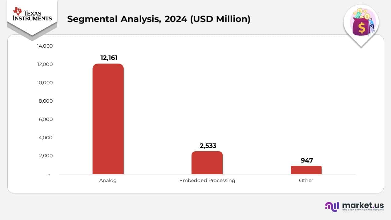 Texas Instruments Statistics: Texas Instruments Incorporated is a global semiconductor company that designs and manufactures semiconductors sold to electronics designers and manufacturers worldwide. The company operates through 2 primary business segments: Analog and Embedded Processing. The Analog segment comprises two key product lines, Power and Signal Chain, that enable efficient power management and precise signal conversion.