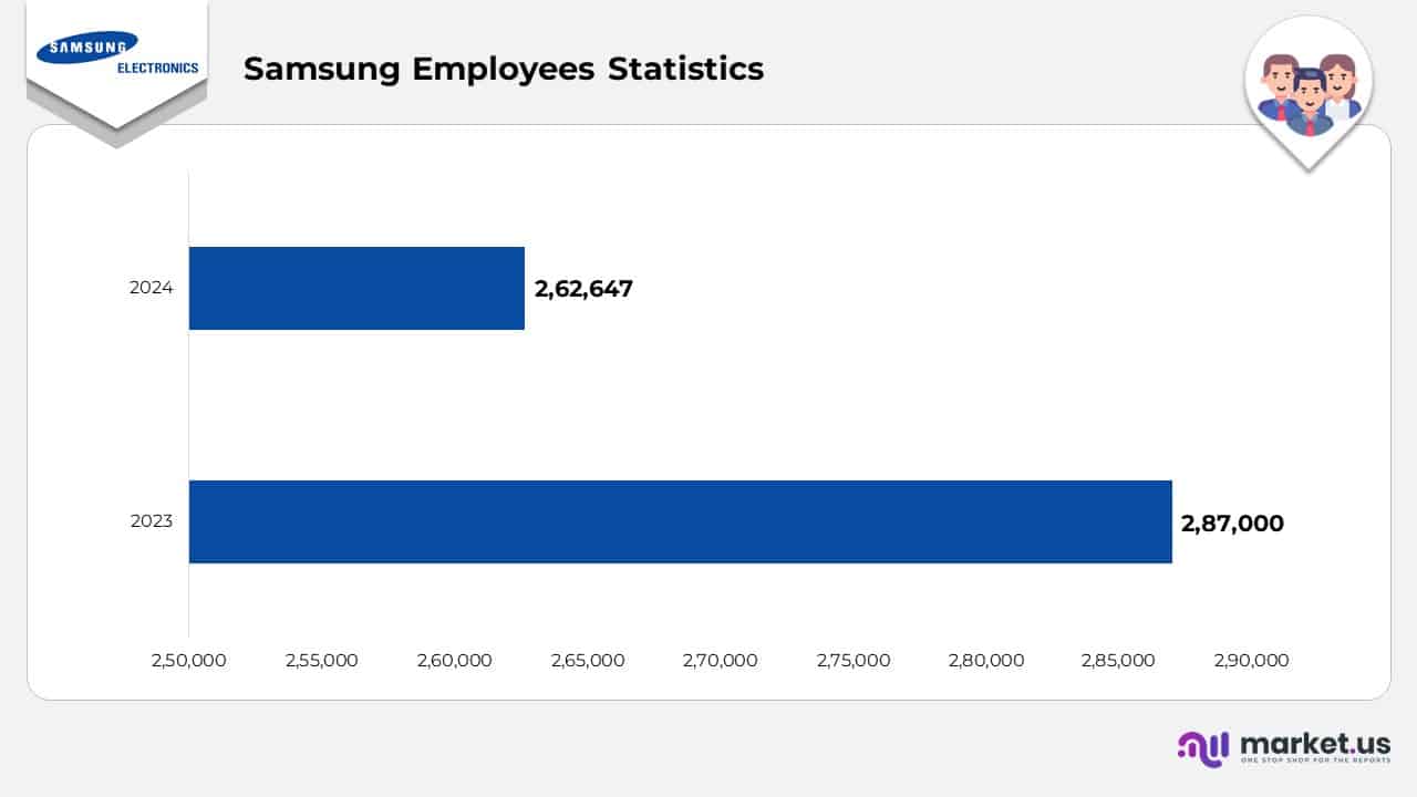 - In 2023, Samsung’s statistics indicated that the company employed more than 287,000 people globally, with around two-thirds of them based outside of South Korea.