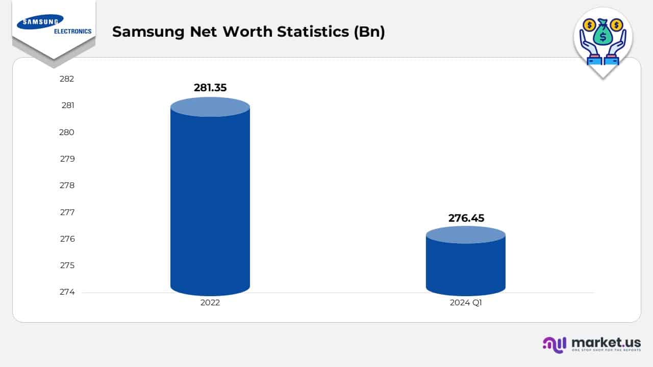 - Samsung’s net worth was assessed at USD 276.45 billion at the end of the first quarter of 2024.