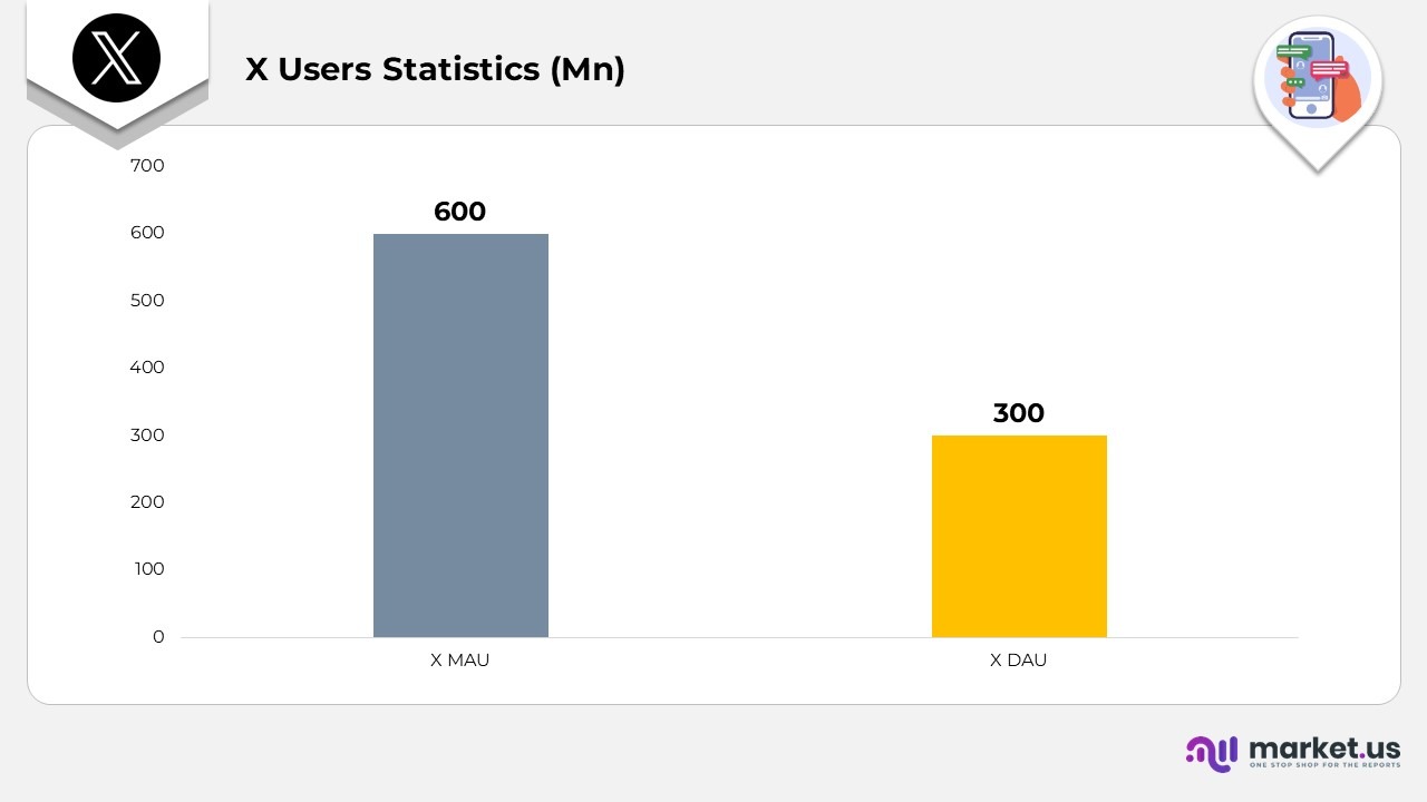 - On May 23, 2024, Elon Musk tweeted that the platform currently has 600 million monthly active users and 300 million daily active users.